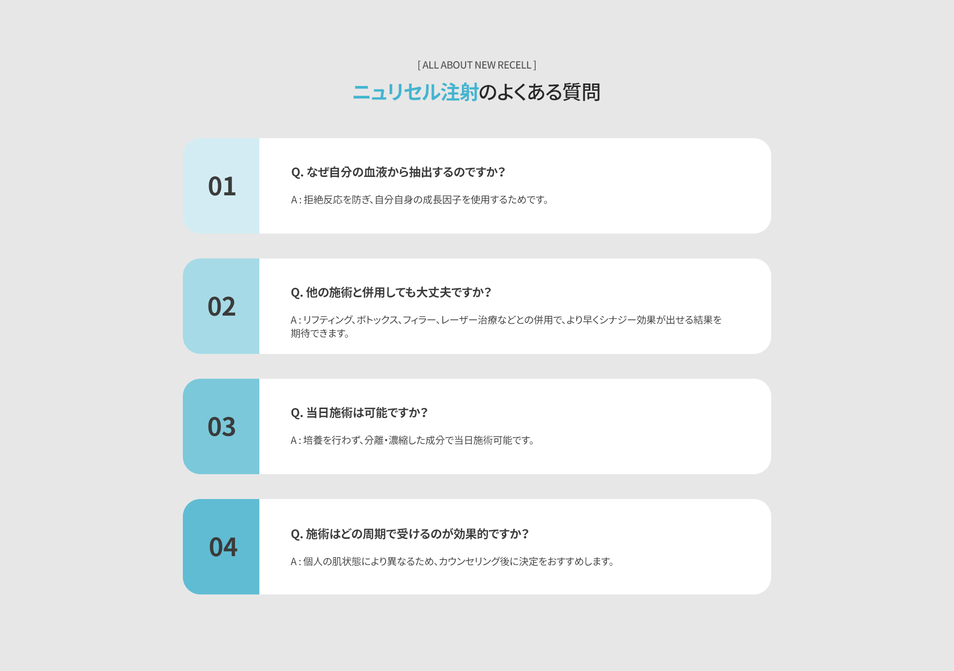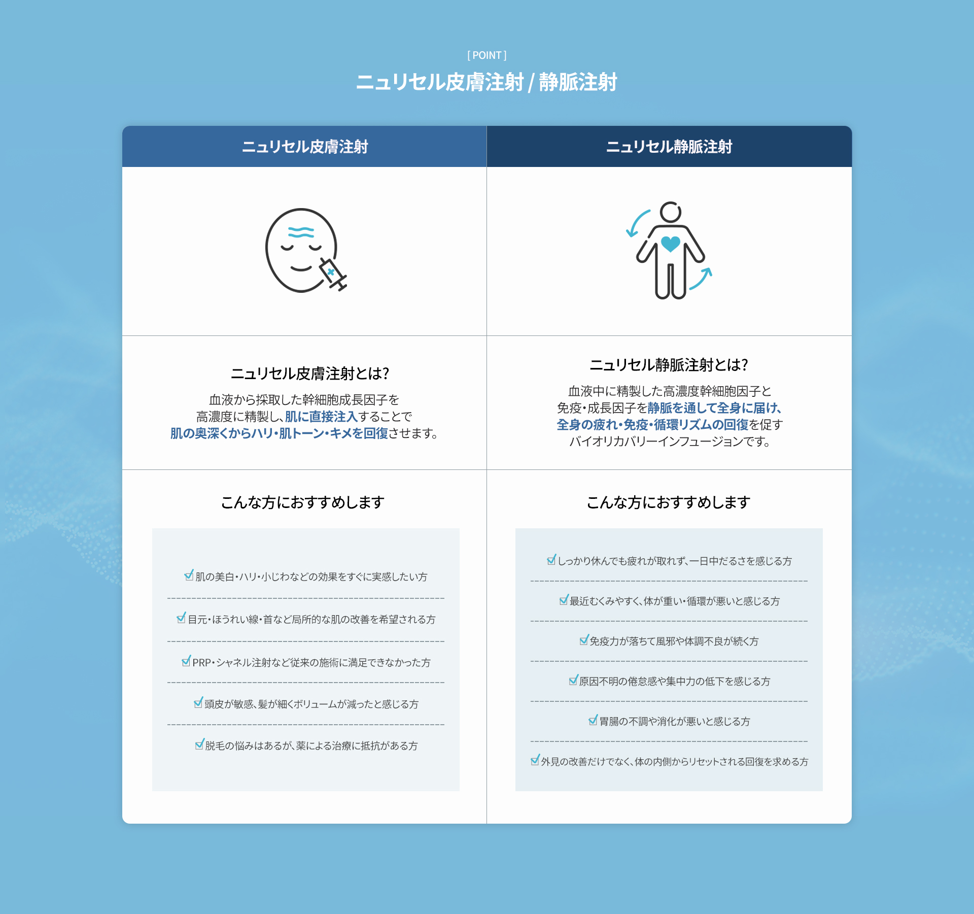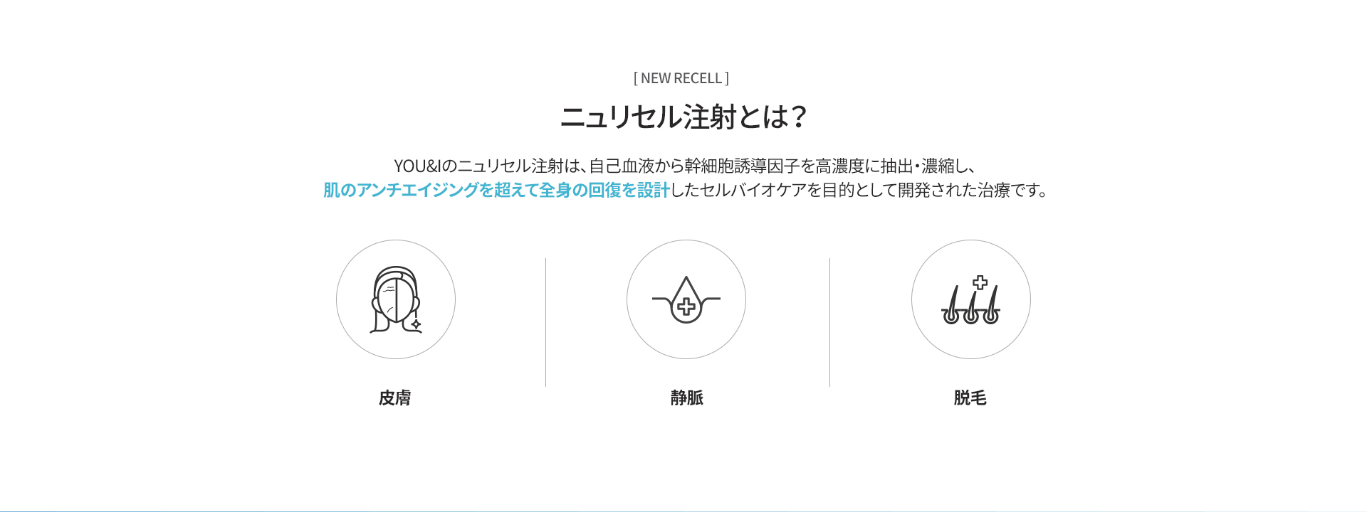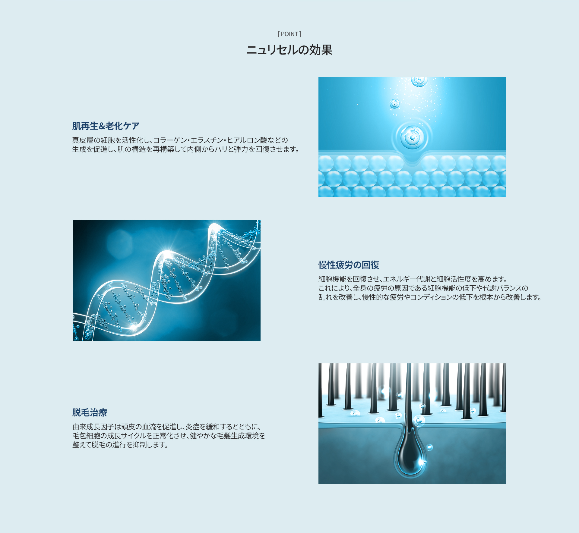 ニュリセル注射は、幹細胞注射は、幹細胞誘導因子を高濃度に濃縮し、肌の再生と回復を促進します。